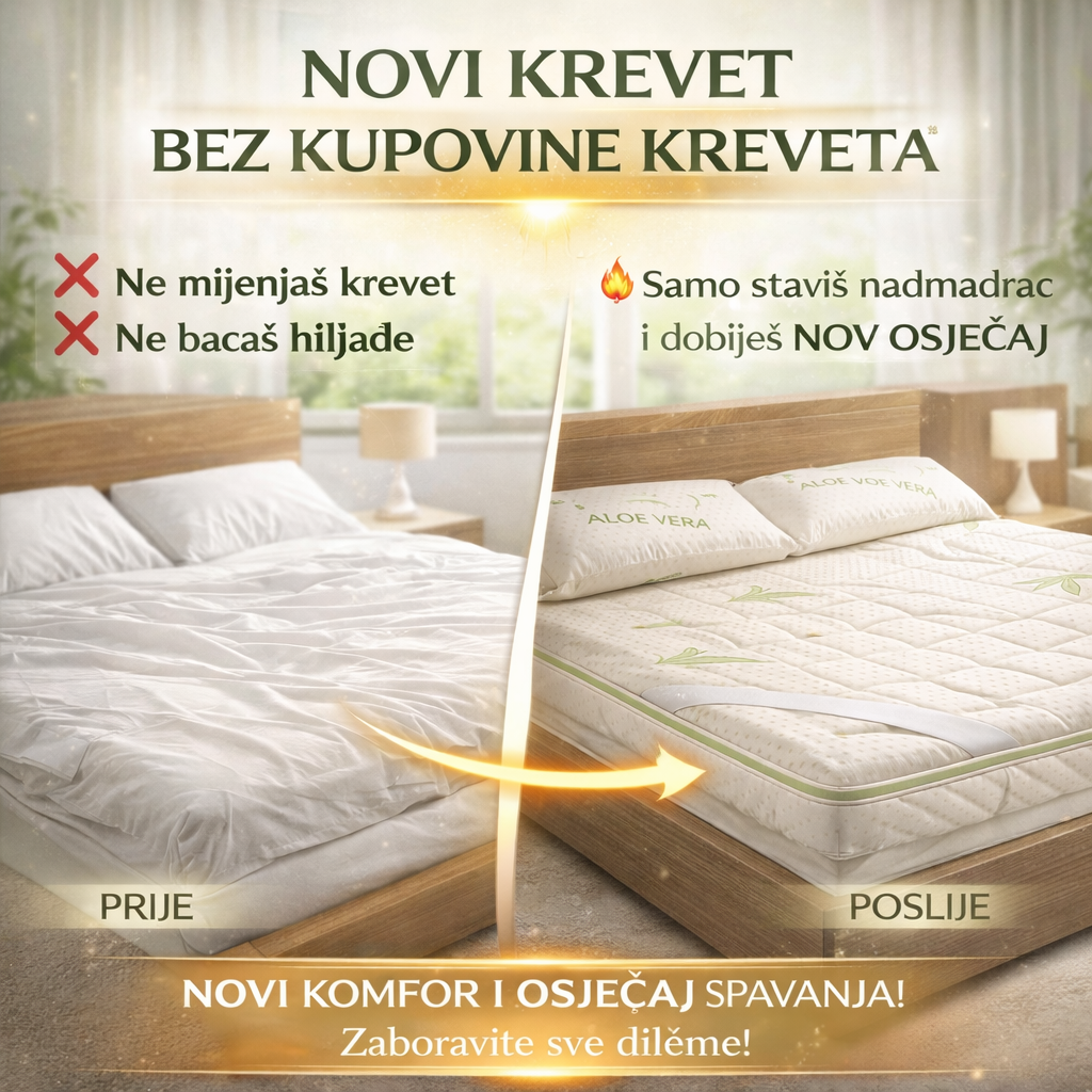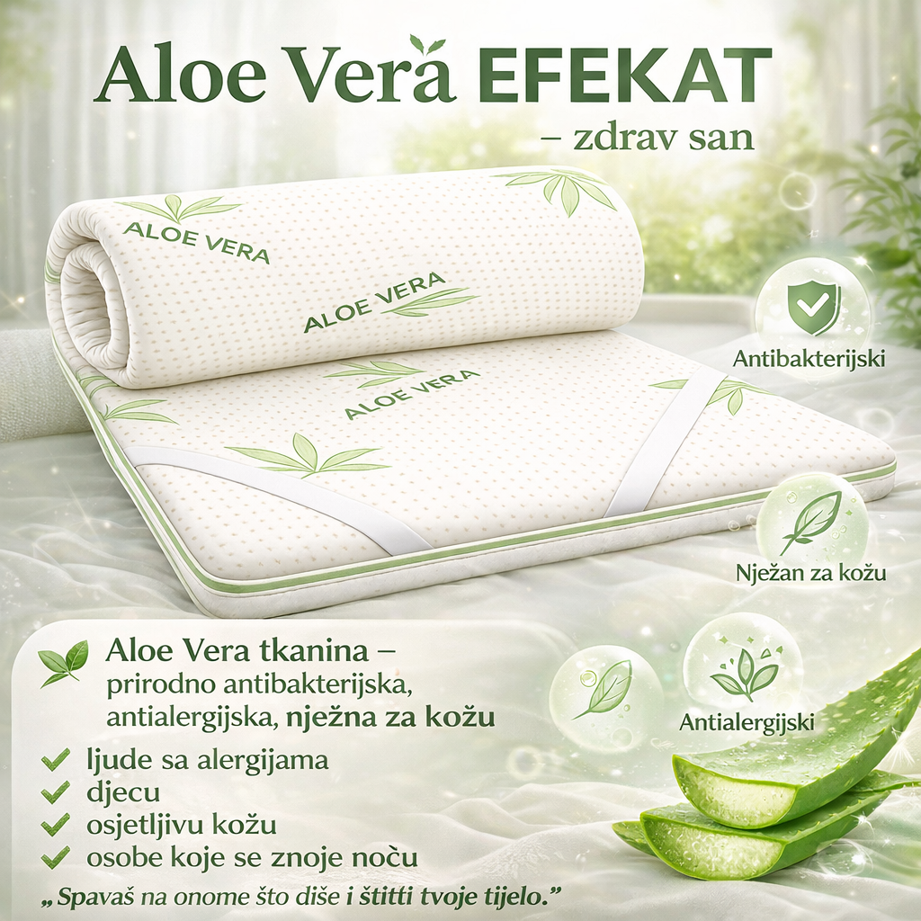 Aloe Comfort Pro 4+1 je premium nadmadrac dizajniran da vašem postojećem krevetu pruži potpuno novi nivo udobnosti i zdravog sna. Zahvaljujući Aloe Vera tkanini, stvara prirodno antibakterijsko i antialergijsko okruženje, nježno prema koži i idealno za osobe s alergijama, djecu i sve koji žele svjež i čist osjećaj tokom cijele noći. ✔️zdravije okruženje za spavanje ✔️manje bolova u leđima i tijelu ✔️veća udobnost postojećeg kreveta ✔️stabilnost bez klizanja ✔️premium izgled ✔️Periva navlaka